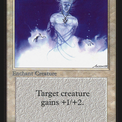 Set: International Collectors’ Edition Type: Enchantment — Aura Rarity: Common Cost: {W} Enchant creatureEnchanted creature gets +1/+2. Read more
