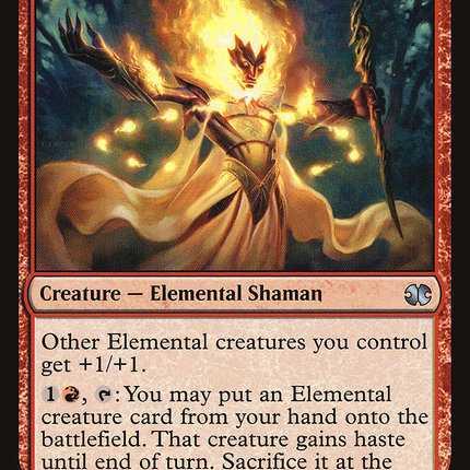 Set: Modern Masters 2015 Type: Creature — Elemental Shaman Rarity: Uncommon Cost: {2}{R} Other Elemental creatures you control get +1/+1.{1}{R},... Read more