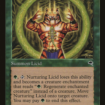 Set: Tempest Type: Creature — Licid Rarity: Uncommon Cost: {1}{G} {G}, {T}: Nurturing Licid loses this ability and becomes an... Read more