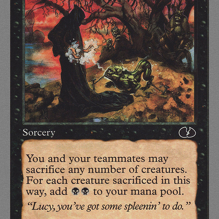 Set: Unglued Type: Sorcery Rarity: Common Cost: {B} Your team may sacrifice any number of creatures. For each creature sacrificed... Read more
