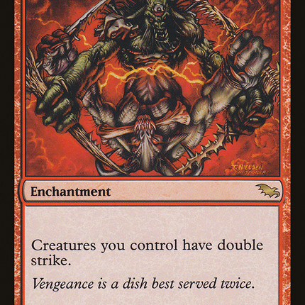 Set: Shadowmoor Type: Enchantment Rarity: Rare Cost: {4}{R}{R} Creatures you control have double strike. Vengeance is a dish best served... Read more